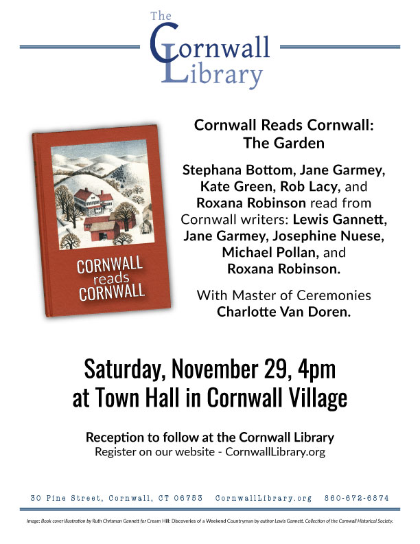 The Library is pleased to present this annual event at which Cornwall residents read Cornwall writers. This year’s Cornwall writers are Lewis Gannett, Jane Garmey, Josephine Nuese, Michael Pollan, and Roxana Robinson. This year’s readers are Stephana Bottom, Jane Garmey, Kate Green, Rob Lacy, and Roxana Robinson. Emcee: Charlotte Van Doren. Please join us at the Library for a reception following the readings. Registration is requested.